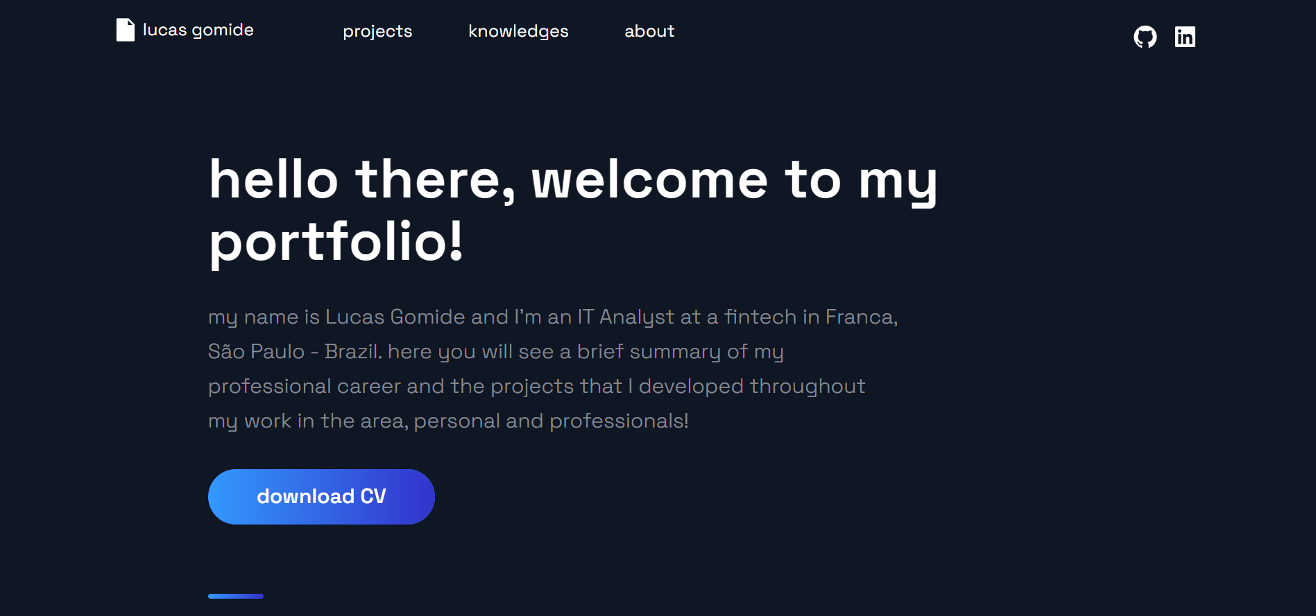 my name is Lucas Gomide and I'm an IT Analyst at a fintech in Franca, São Paulo - Brazil. here you will see a brief summary of my professional career and the projects that I developed throughout my work in the area, personal and professionals!